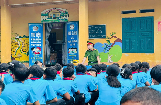 Ảnh: Công an xã Tân Kỳ tuyên truyền phổ biến pháp luật cho học sinh trên địa bàn xã