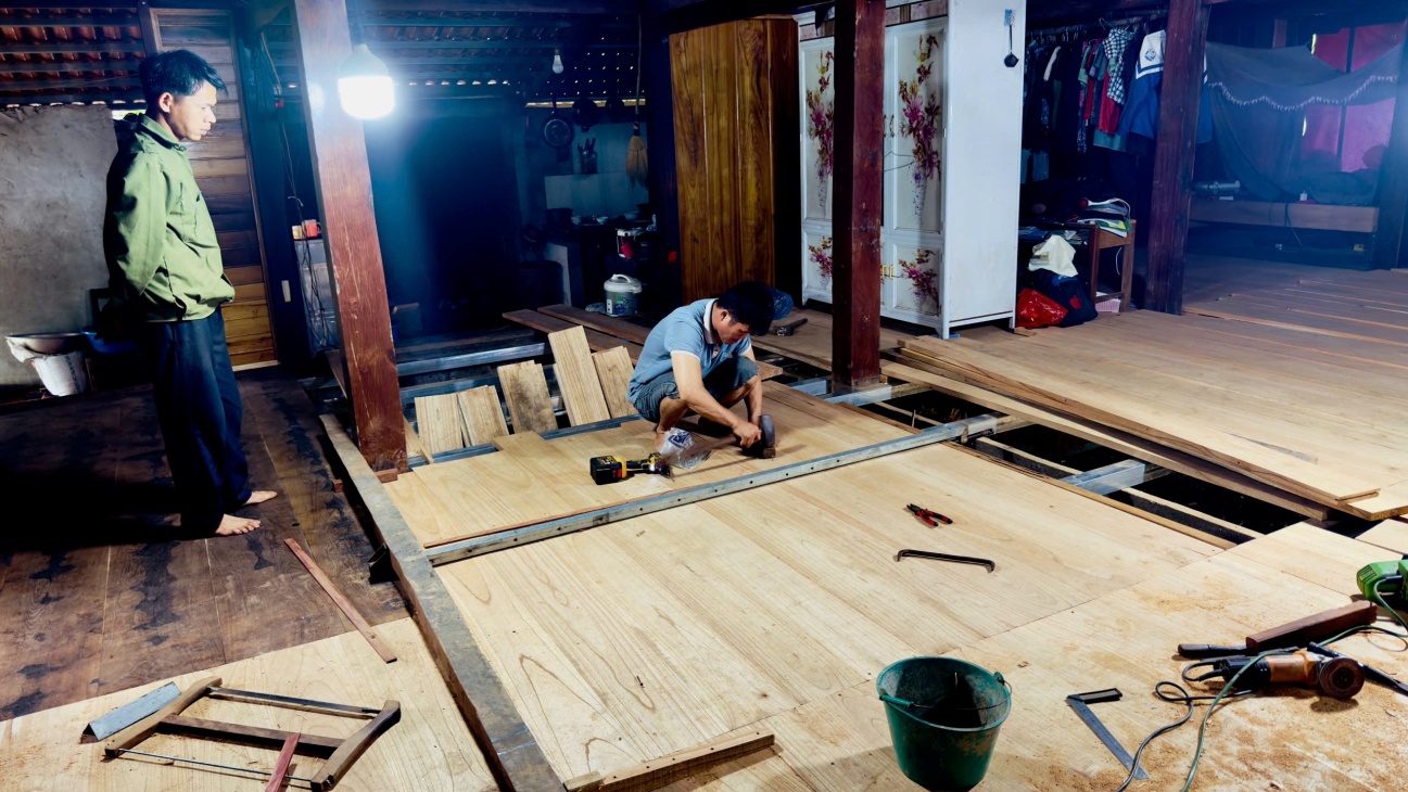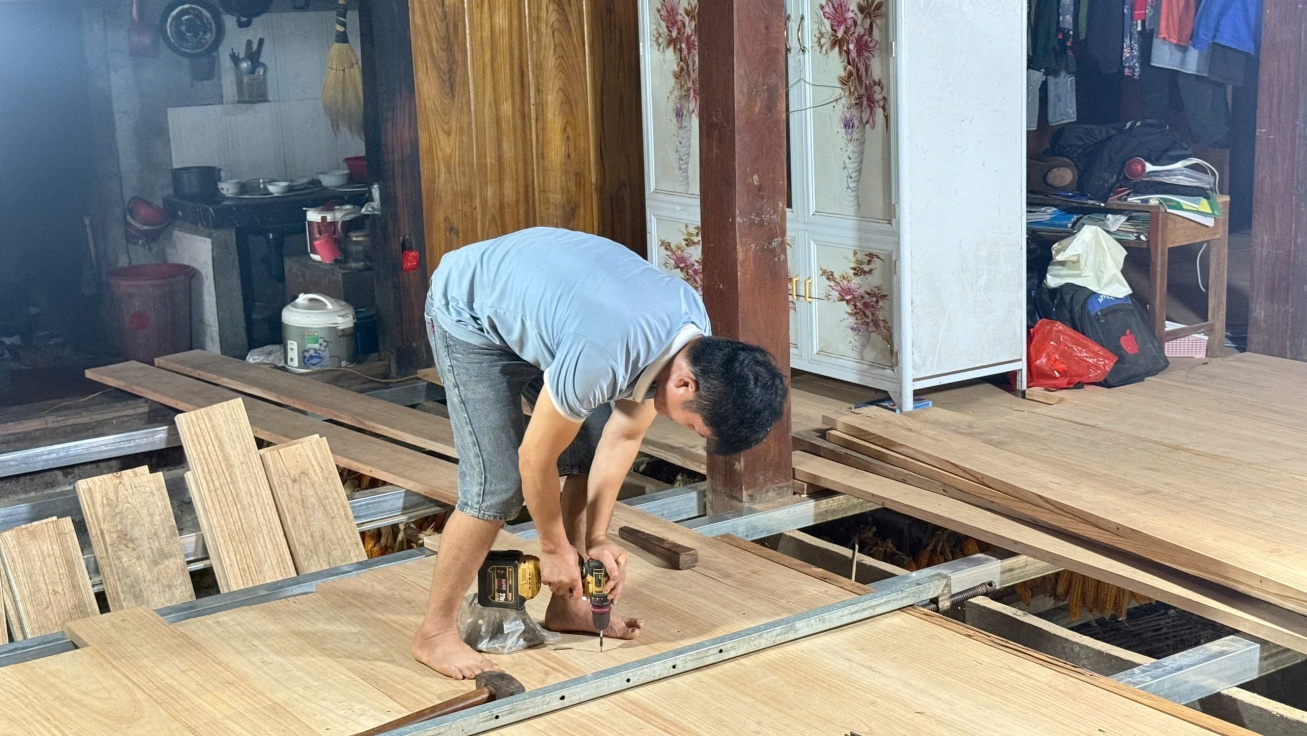 Dù ngoài trời đang mưa lớn, trong nhà thợ mộc vẫn đang gấp rút hoàn thiện để đảm bảo tiến độ công trình.